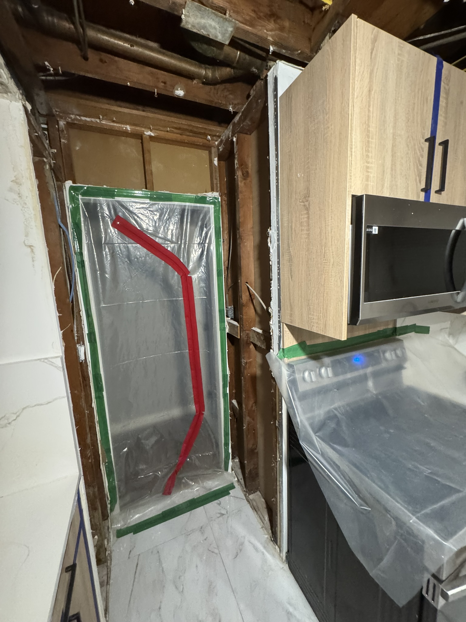 To access and properly dry the structure, portions of the ceiling, cabinetry, and damaged building materials were carefully removed. This allowed our team to expose the underlying framing, plumbing, and subfloor where moisture had accumulated.