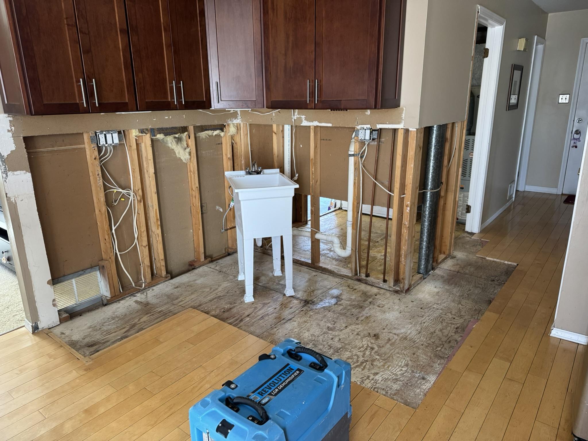 Our team provided comprehensive water damage restoration services, including immediate water extraction, identifying and repairing the source of the leak (a burst pipe), complete demolition of all compromised materials such as water-damaged cabinets, drywall, and flooring, followed by thorough drying and dehumidification using specialized equipment. We ensured structural drying and prepared the property for complete reconstruction and restoration.