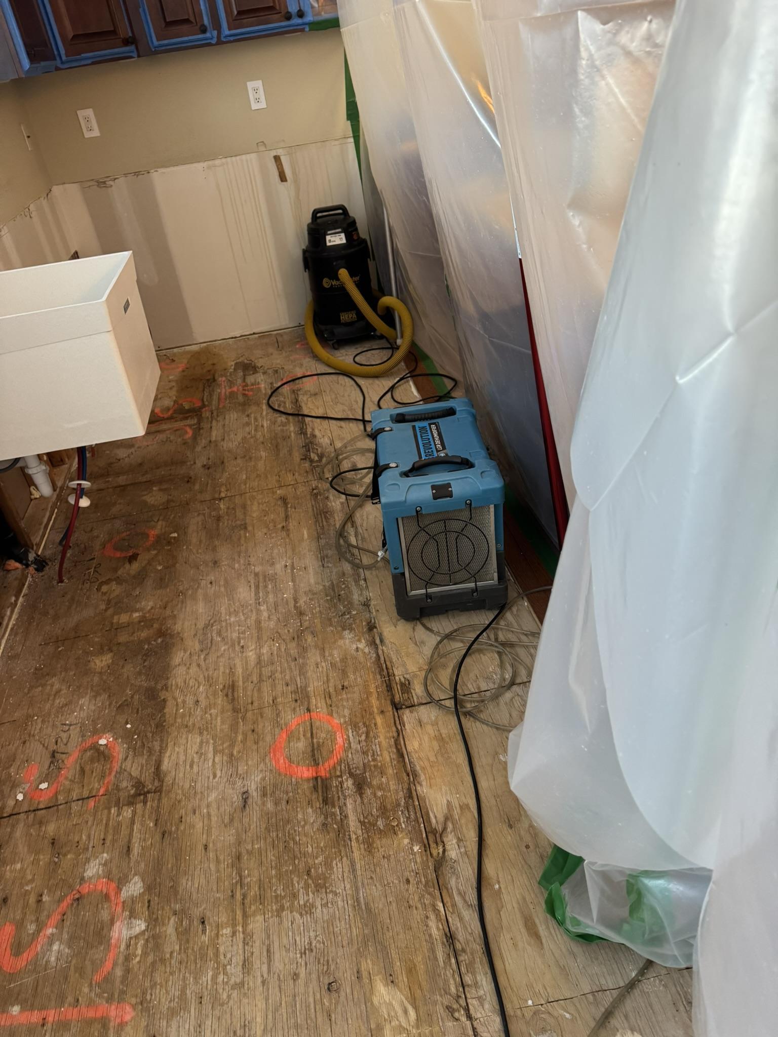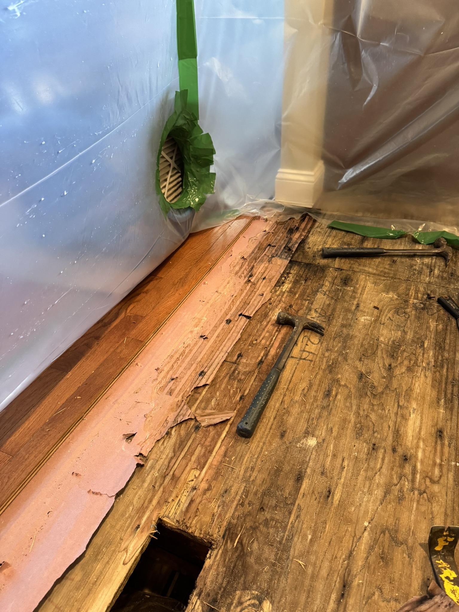 Our team conducted a thorough assessment of the water damage, followed by the careful removal of damaged hardwood flooring and subfloor materials. We implemented containment protocols to prevent further spread and used specialized drying equipment, including air movers and dehumidifiers, to thoroughly dry the affected structural components. Additionally, anti-microbial agents were applied to remediate potential mold growth and sanitize the area.
