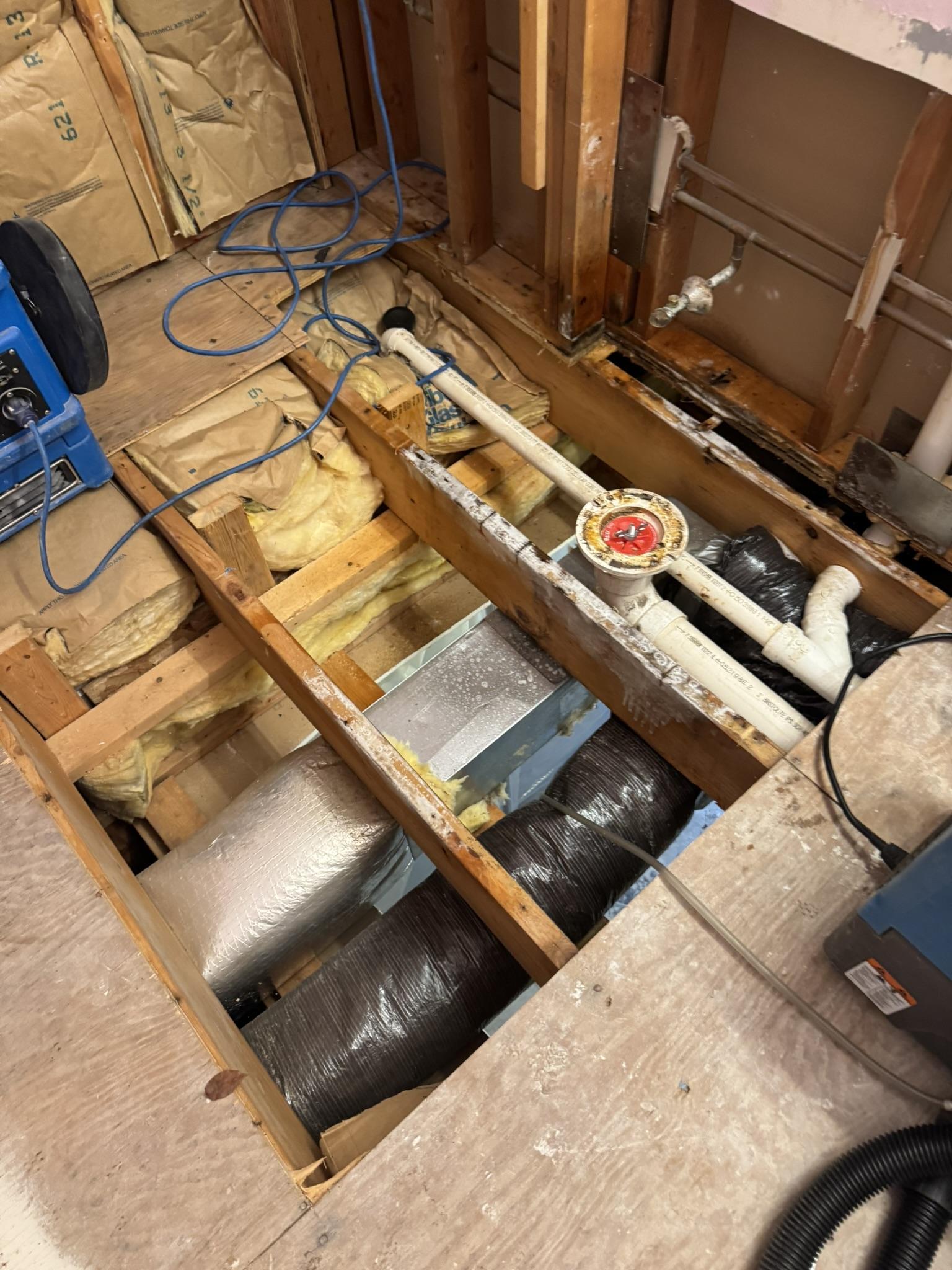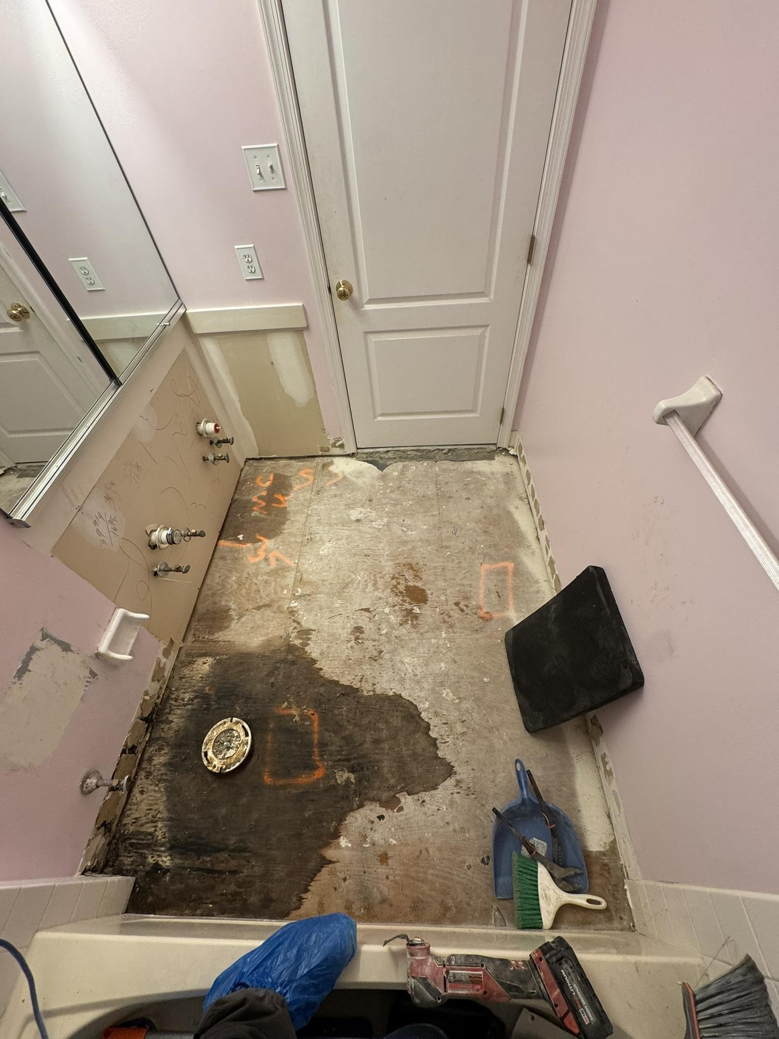 Our team performed a comprehensive water damage assessment, followed by the careful demolition and removal of all affected bathroom flooring and subfloor materials. We then implemented advanced drying and mitigation techniques, including the use of industrial fans, to thoroughly dry out the area and prevent further damage or mold growth, preparing the space for complete restoration.