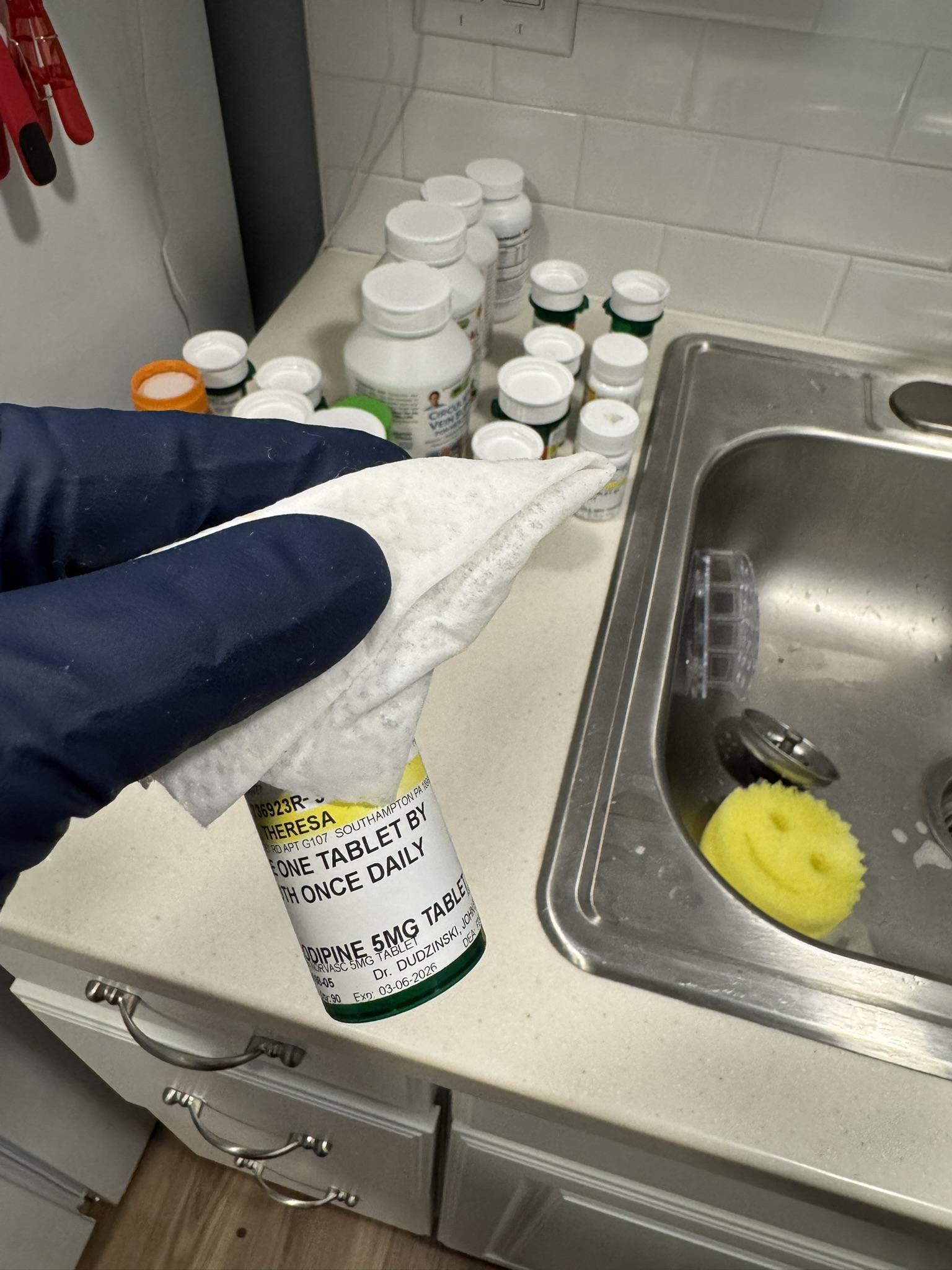 Our team provided comprehensive biohazard remediation, which included the safe disposal of medical waste and soiled materials from a designated area. We meticulously cleaned and prepared various pharmaceutical bottles for proper disposal and performed thorough disinfection of affected surfaces, including sanitizing a shower chair and the surrounding shower area to ensure a safe and hygienic environment.