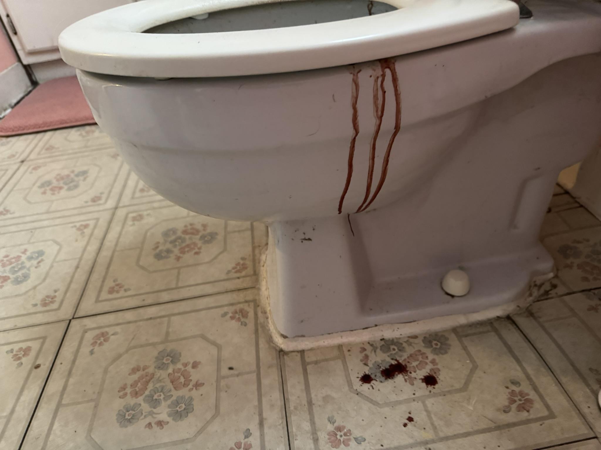 The customer experienced a biohazard situation involving significant blood and biological contamination in their property, affecting a toilet, carpet, and wooden furniture.