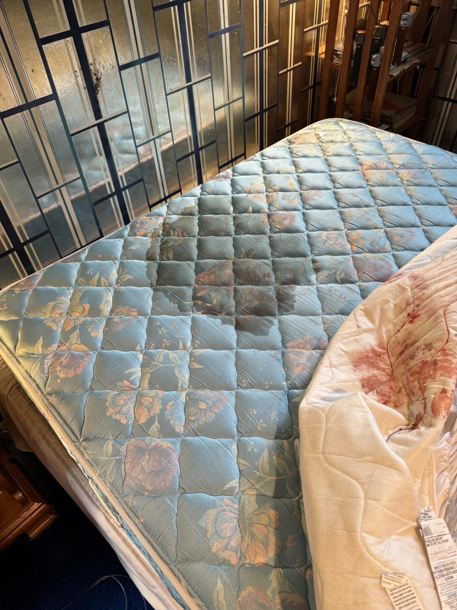 The customer experienced a traumatic event resulting in significant biohazard contamination on a wall and a mattress, requiring professional trauma and biohazard cleanup services.