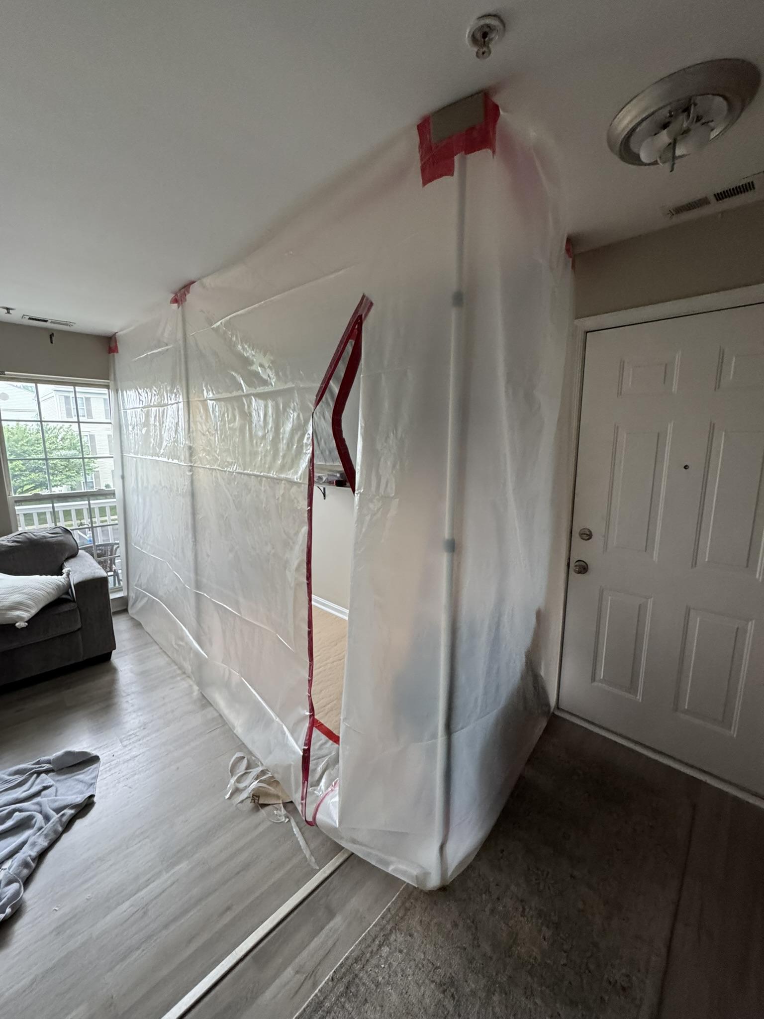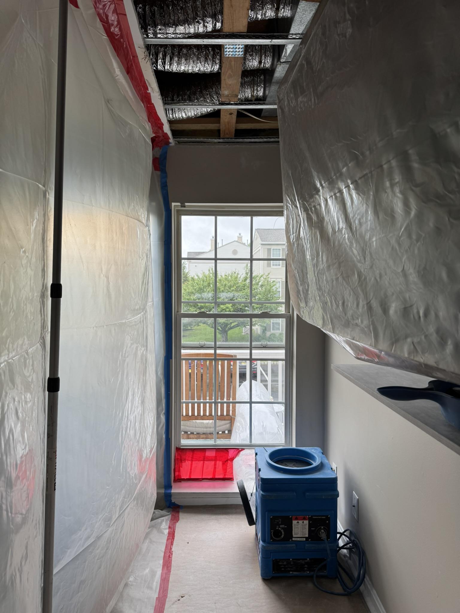 Water damage restoration services were provided, including containment, dehumidification, and removal of damaged materials.