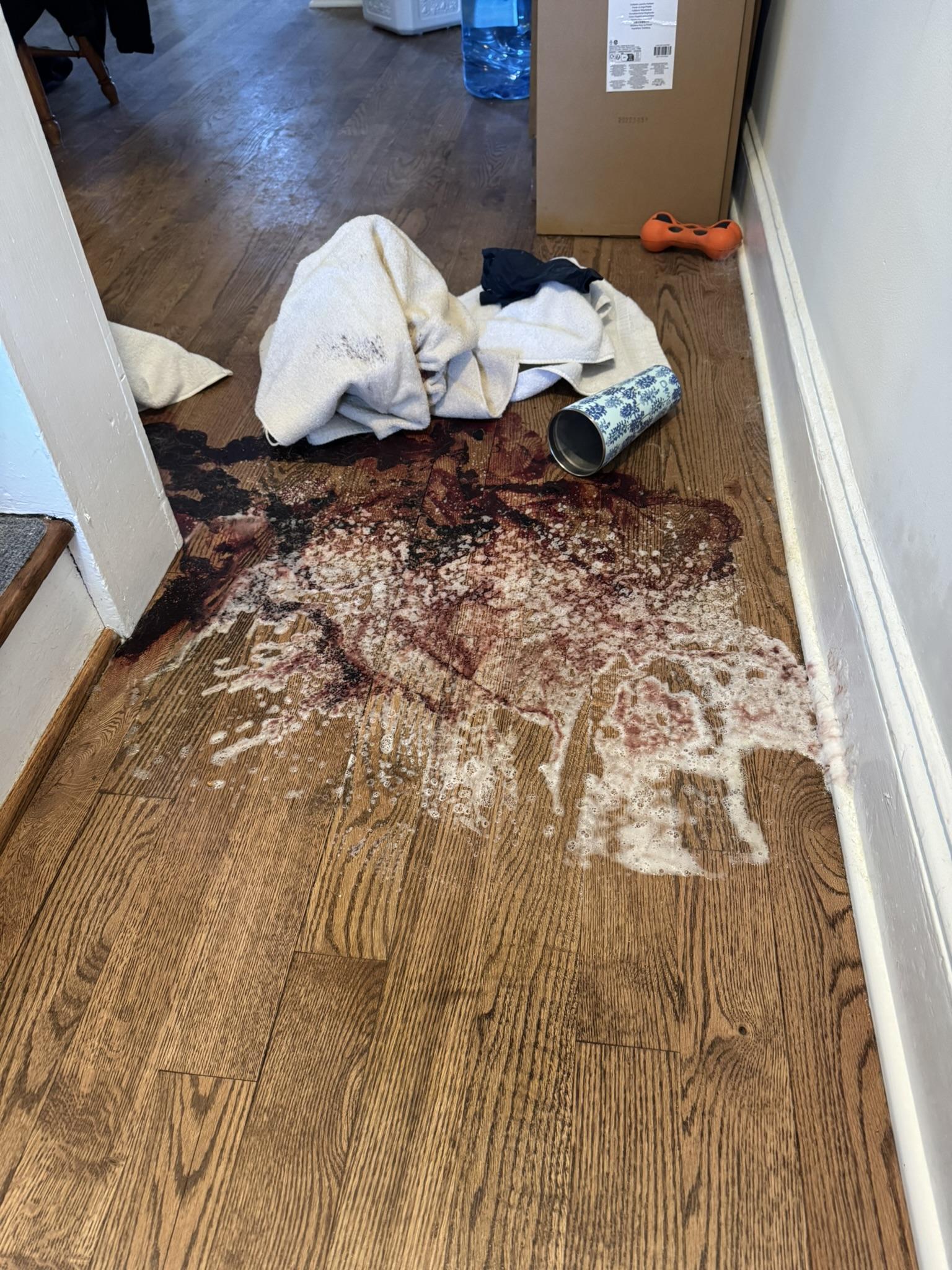 The customer experienced a biohazard spill on their hardwood flooring, requiring immediate and specialized cleanup to ensure safety and hygiene.